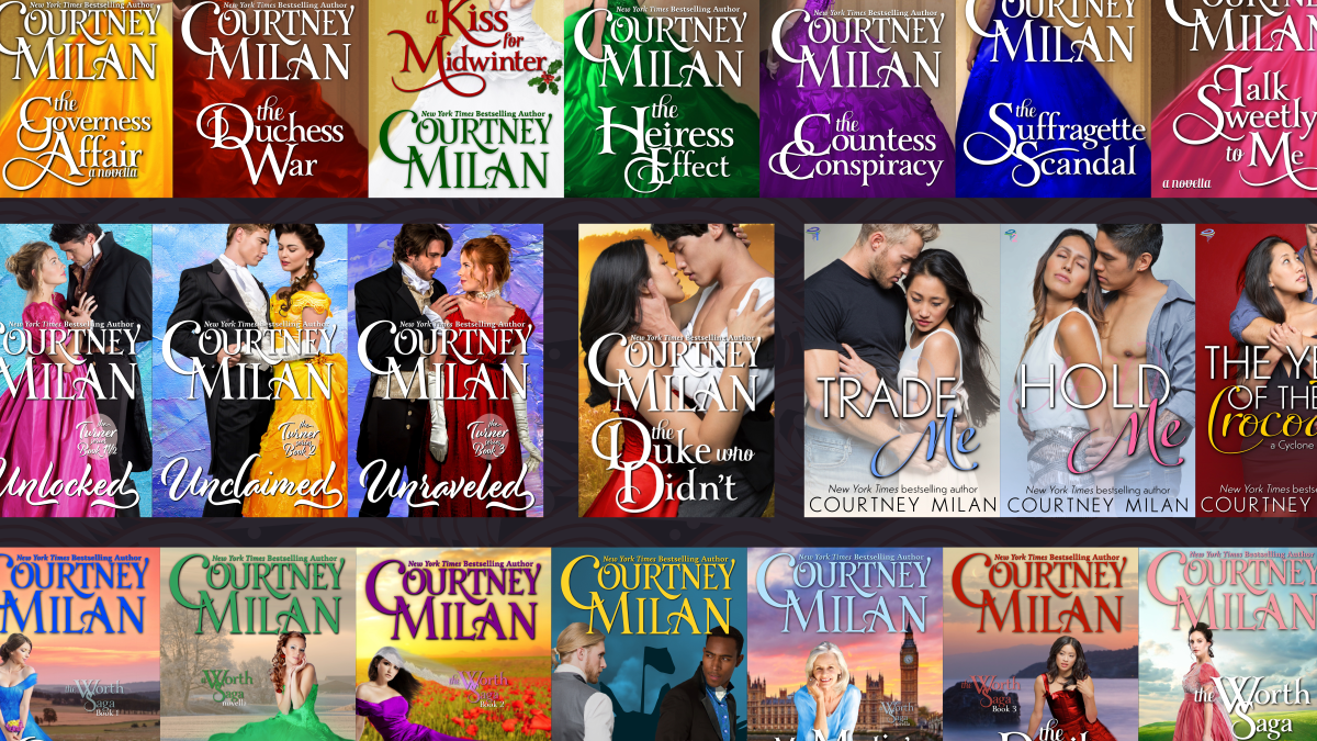 Η Courtney Milan ζει στη βορειοδυτική γωνία των Ηνωμένων Πολιτειών με τον σύζυγο της, ένα μεσαίου μεγέθους σκύλο, και μια επιθετική γάτα.
